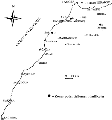 Terfez (Terfezia leptoderma jeune) marron clair et Tirmania (Tirmania pinoyi) marron foncé Selon Naoual B. : pour l'espèce blanche il pourrait s'agir aussi soit de Tirmania pinoyi ou Tirmania nivea (selon la forme et la dimension des ascospores) pour l'espèce marron il peut s'agir soit de Terfezia boudieri ou de Terfezia claveryi, (cette nomencalture , selon les travaux des chercheurs de l' Ecole Nationale d'Agriculture de Méknes, réalisés dans la région de collecte de ces espèces : région de Bouaarfa) Recevant régulièrement des questions sur les truffes des sables, truffes du désert ainsi que des propositions pour vendre ces champignons sur le marché français, devant le manque de connaissances des internautes nord-africain qui m'écrivent à propos de ces truffes, j'ai décidé de placer un extrait de l'article de Lahsen KHABAR sur les truffes marocaines. Pour toute information complémentaire je vous invite à écrire ou vous rapprocher de l'Université Mohammed-V (adresse ci-dessous ; un lien vers leur site à venir). Il ne faut en aucun cas confondre les truffes des sables Terfez ou Tirmania avec les truffes du genre Tuber. Les terfass sont abondants et utilisés comme légume en cuisine. Les tuber sont relativement rares et si parfumés qu'on peut les considérer comme un condiment qui parfume les sauces (entre 3 à 10% suffisent).   Les Terfess et les Truffes du Maroc : Biodiversité et Valorisation Broché - 28 décembre 2016 de Lahsen Khabar Merci aux auteurs de leur soutien. Si vous souhaitez passer une annonce (payante) pour vendre des Terfess rendez-vous sur la page de ce site : www.truffe-passion.fr CONTRIBUTION A L'ÉTUDE DE LA FLORE MYCOLOGIQUE DU MAROC LES TRUFFES MAROCAINES (DISCOMYCÈTES) Extrait du Bull. Soc. mycol. Fr. 117 (3), p. 213-229. 2001. Lahsen KHABAR*, Larbi NAJIMK, Marie-Claude JANEX-FAVRE** et Agnès PARGUEY-LEDUC * Université Mohammed-V., faculté des sciences, département de biologie, laboratoire de botanique (mycologie), B. R 1014, Rabat. (Maroc). ** Université Pierre-et-Marie-Curie, laboratoire de parasitologie végétale, B. R 155, F-75252 Paris-Cedex 05. (France). INTRODUCTION LE MOT « truffe » désigne l'ascocarpe d'ascomycètes hypogés classiquement reconnus comme des discomycètes de l'ordre des tubérales, ordre qui a toutefois été abandonné par divers auteurs et rattaché à celui des pézizales (KORF, 1973 ; TRAPPE, 1979 ; DONADINI, 1983 ; ERIKSSON, 1999). Des études d'ordre cytologique et ultrastructural, concernant les deux genres Tuber et Terfezia (PARGUEY-LEDUC et coll., 1987a, 1987b, 1988, 1989 et 1990 ; JANEX-FAVRE & PARGUEY-LEDUC, 1985 ; JANEX-FAVRE et coll., 1988 ; KHABAR et coll., 1994) ont montré que les tubérales diffèrent des pézizales sur de nombreux points essentiels ; si elles dérivent probablement d'un ancêtre commun, elles ont dû évoluer séparément au sein des discomycètes. Les tubérales sont représentées au Maroc par plusieurs espèces appartenant aux genres Delastria, Picoa, Terfezia, Tirmania et Tuber. Ces diverses espèces sont communément appelées « Terfass » ; elles se distinguent les unes des autres par la zone de récolte, la taille, la couleur ; la consistance des ascocarpes ainsi que, parfois, par l'hôte auquel elles sont associées. Ainsi, on parle de « Terfass rouge de Tafilalet », « Terifass blanc de Tafilalet », « Terfass rose de Mamora », « Terifass noir de zaïr », « Terifass de taïda », « Terifass mâle », « Terfass indicateur », etc. Ce sont des espèces comestibles qui font l'objet d'un commerce local important et très actif. La plupart sont printanières, quelques-unes (Delastria rosca, Terfezia leptoderma et Tuber oligaspermum) apparaissent par contre dès les mois de novembre et de décembre. En règle générale les truffes marocaines sont récoltées au voisinage des plantes herbacées du genre Helianthemulm, notamment H. gattatum (syn. Tuberaria guttata L. Foureau) et H. Iipii, ou des pins, Pinus pinaster var. atlantica en particulier, avec lesquels elles forment des associations mycorhiziennes. La méthode de récolte la plus courante est celle dite « à la marque » (le sol est souvent gonflé et fendillé en surface au pied de la plante hôte). Les travaux relatifs aux truffes marocaines sont trés peu nombreux. Les études effectuées sont essentiellement d'ordre taxinomique et floristique (CHATIN, 1891 a, 1896 b; MALENÇON, 1973; KHABAR, 1984) ou cytologique et ultrastructural (KHABAR, 1988; KHABAR et coll., 1994). Dans la présente contribution, nous présentons un travail floristique illustrant les différentes espèces de truffes récoltées dans diverses régions du Maroc et des données écologiques et climatiques relatives à leur récolte. Nous proposons une clé préliminaire ; ce travail pourra ainsi servir de catalogue raisonné pour les truffes marocaines. (...) CARACTÉRISTIQUES ET RÉPARTITION DES ZONES TRUFFICOLES AU MAROC Lors de nos prospections, nous avons pu constater que le développement des truffes marocaines nécessite, d'une part, des conditions climatiques et édaphiques particulières et, d'autre part, la présence de plantes-hôtes en forte densité et en pleine vigueur. Elles ont besoin, en général, de sols sableux bien structurés, aérés et permettant une meilleure circulation des éléments minéraux. Du point de vue climatique, elles sont adaptées à des conditions tempérées avec alternance de saisons. Leur production est conditionnée par des niveaux de précipitations favorables au début de l'automne, pour certaines espèces, ou le plus souvent en hiver et au printemps pour d'autres. Cependant, leur cycle biologique peut être perturbé par des précipitations excessives ou mal réparties ou par des périodes de froid prolongées ou de fortes chaleurs. Nos différentes prospections nous ont amenés à établir une carte de répartition des truffes et des zones trufficoles au Maroc ; ces zones sont au n
