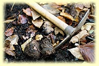 Pour déterrer la truffe, le caveur déblaye délicatement la terre autour de la truffe juste à l'endroit marqué par l'animal truffier avec un piochon à fer droit. Chaque caveur à son petit outil -à lui -, son outil fétiche. L'essentiel est de gratter autour de la truffe pour la dégager délicatement de la terre sans abîmer ni la truffe ni les racines. C'est l'outil de base indispensable.